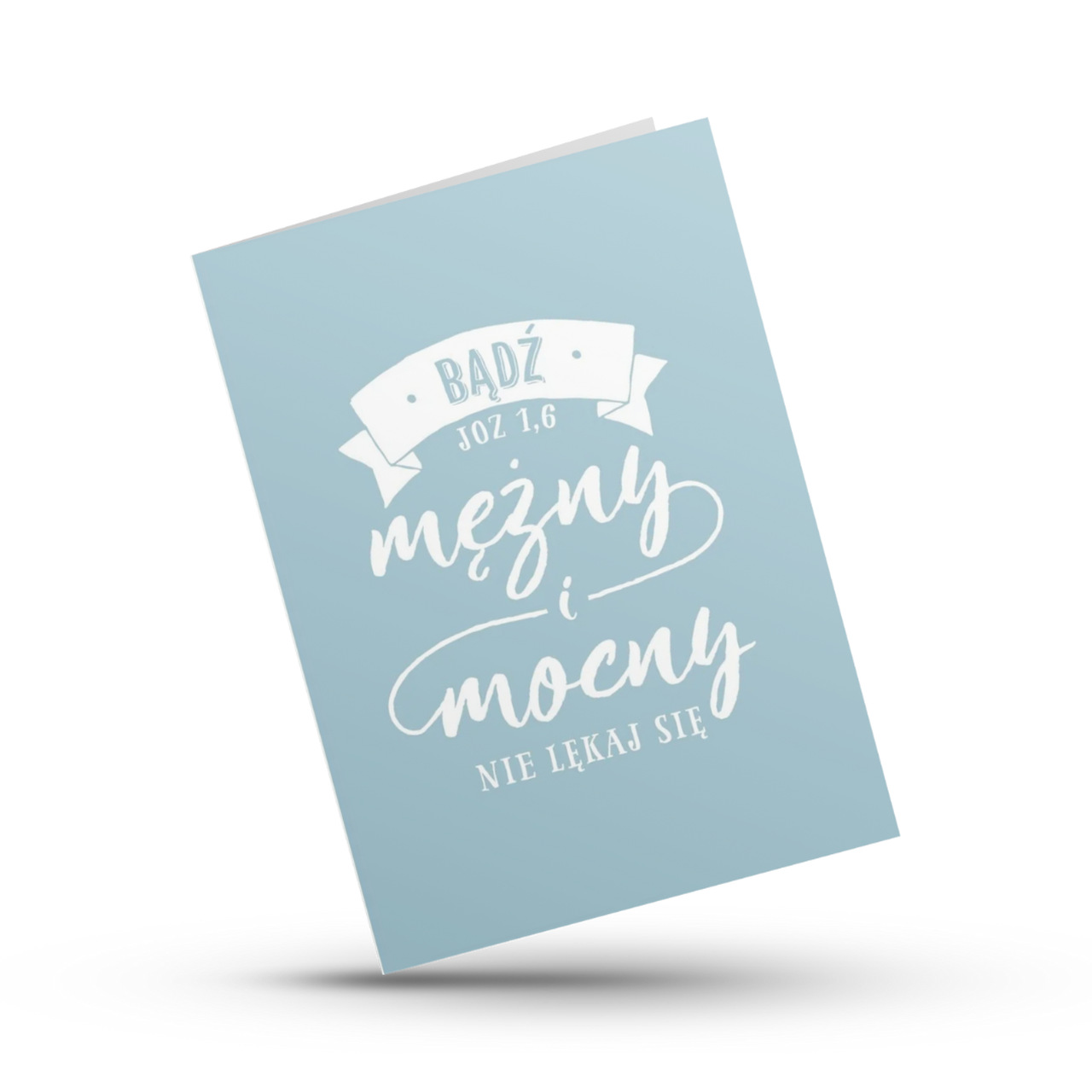 Kartka z cytatem z Księgi Jozuego 1,6 to przypomnienie o odwadze, wierze i Bożej obecności. Prosty, niebieski design podkreśla jej ponadczasowy charakter – idealna na kartkę dla mężczyzny.