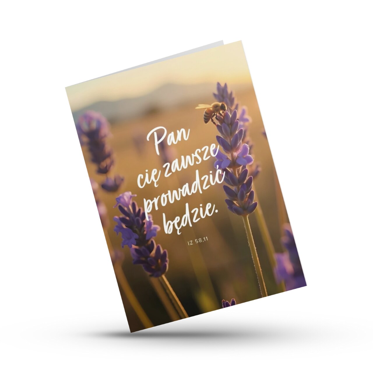 Subtelna kartka z motywem lawendy i pszczoły, niosąca przesłanie pokoju i Bożego prowadzenia. Idealna, by dodać otuchy lub przekazać błogosławieństwo bliskiej osobie.