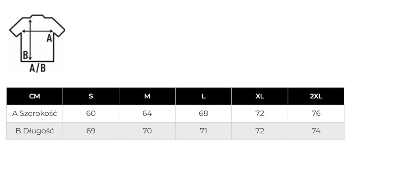 L: szerokość pod pachami mierzona na płasko 76cm ; długość mierzona od najwyższego punktu ramienia 74cm