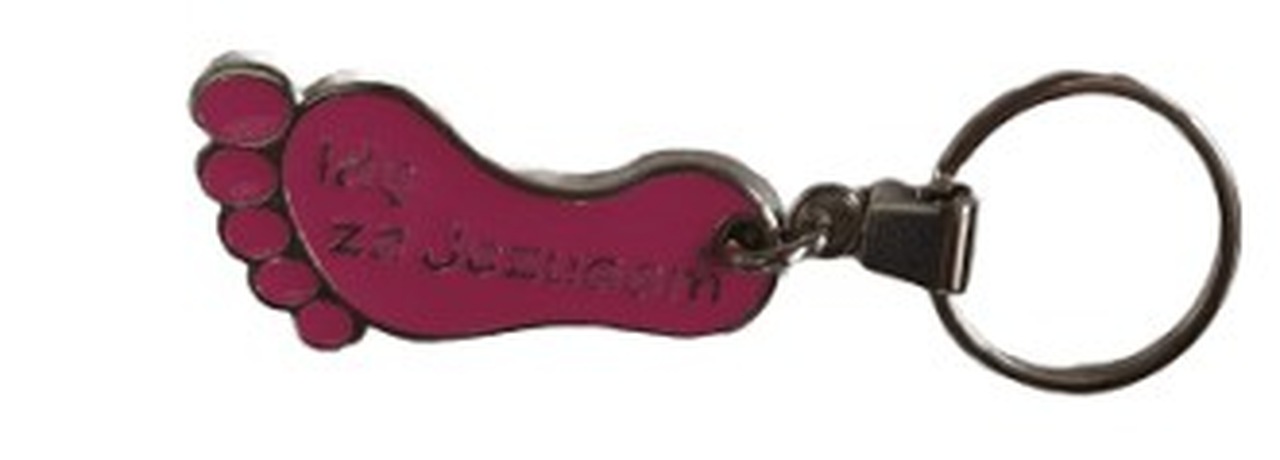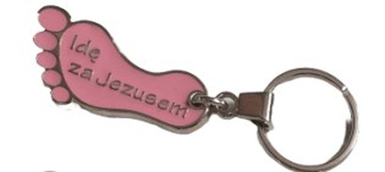 Gadżet chrześcijański do kluczy w kształcie stopy z niebieskim lakierem i napisem Idę za Jezusem, zaś z drugiej strony wyryty ten sam tekst po angielsku: I follow Jesus