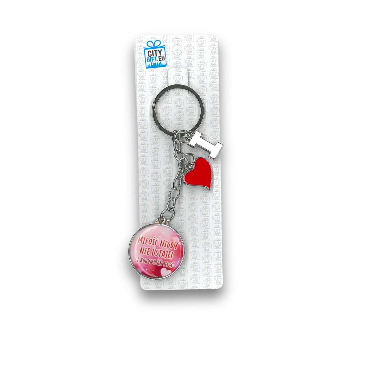 Brelok metalowy – Miłość nigdy nie ustaje