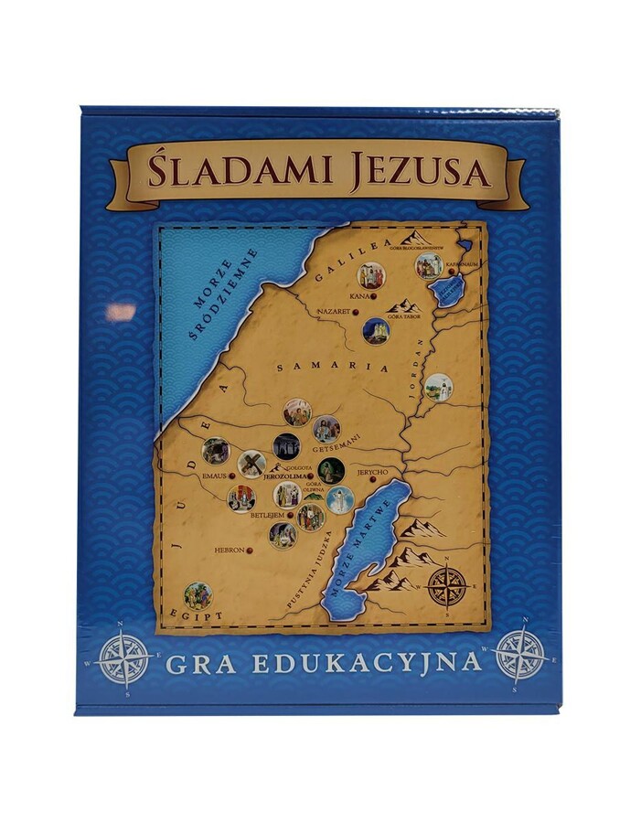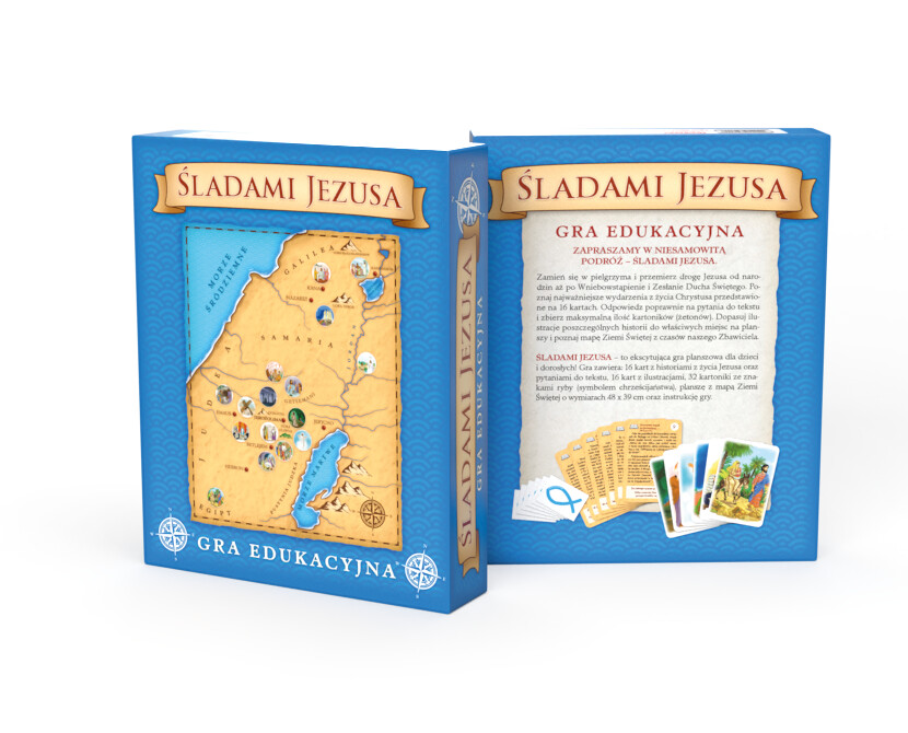 Zamień się w pielgrzyma i przemierz drogę Jezusa od narodzin aż po Wniebowstąpienie i Zesłanie Ducha Świętego. Poznaj najważniejsze wydarzenia z życia Chrystusa przedstawione na 16 kartach. Odpowiedz poprawnie na pytania do tekstu i zbierz maksymalną ilość kartoników (żetonów). Dopasuj ilustracje poszczególnych historii do właściwych miejsc na planszy i poznaj mapę Ziemi Świętej z czasów naszego Zbawiciela.
