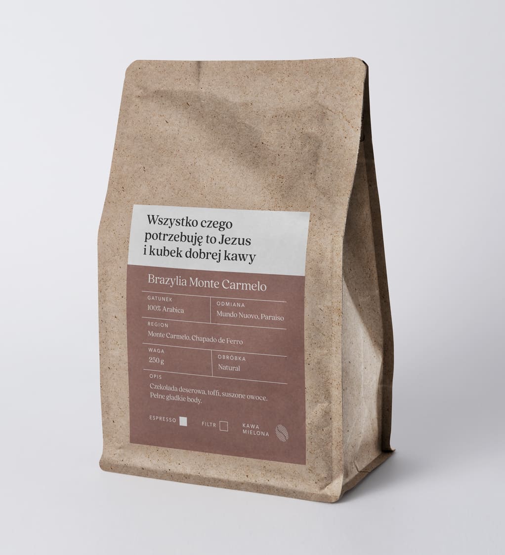 „Wszystko, czego potrzebuję to Jezus i kubek dobrej kawy.” Ta propozycja to codzienna porcja aromatu i pokoju. Brazylijska arabica specialty o intensywnym smaku czekolady i toffi z subtelną nutą owocową.