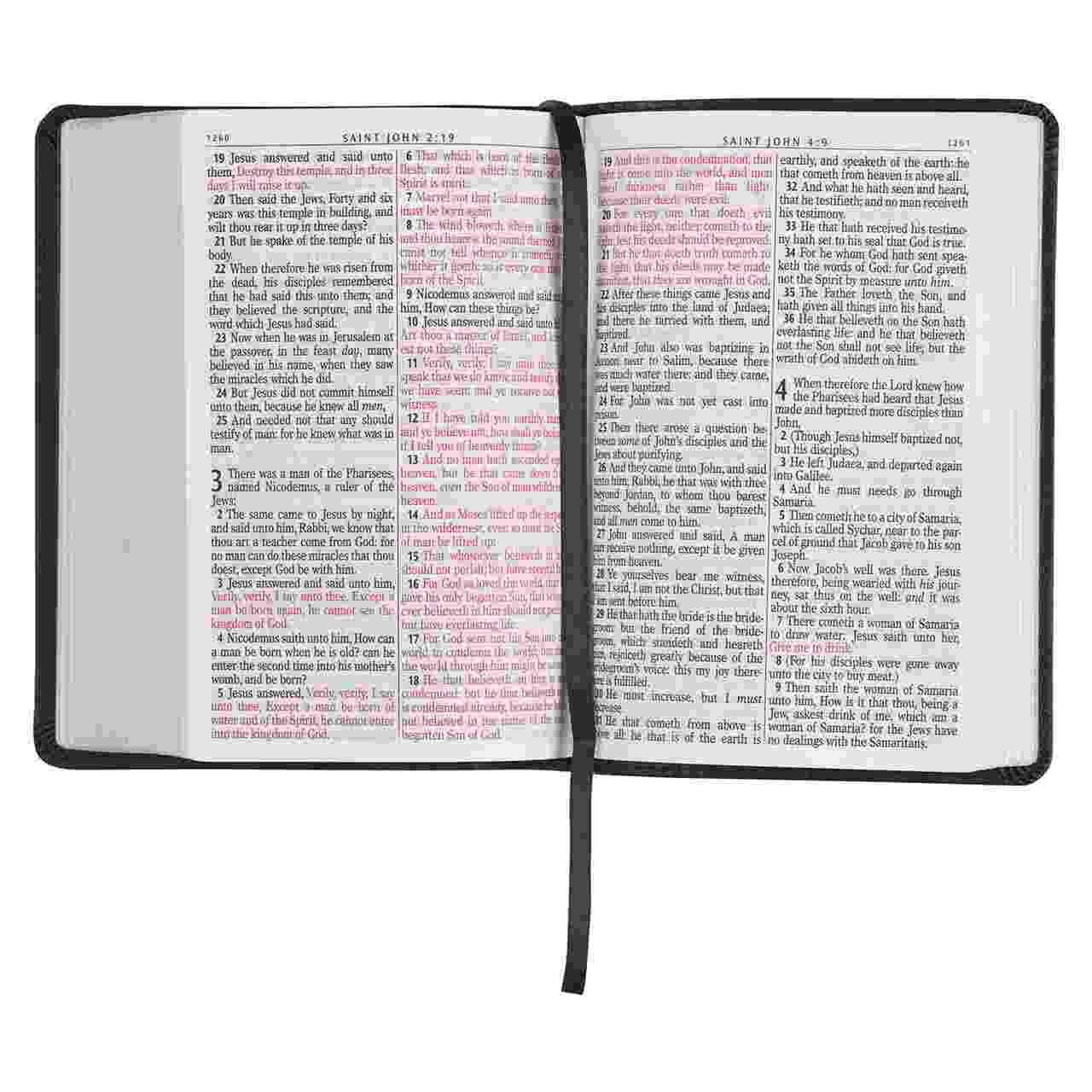Czarna  skórzana, duża, kompaktowa Biblia King James Version ma łatwy do odczytania nadruk i jest w sam raz, by zmieścić się w torebce lub teczce. Chociaż sama Biblia jest o wiele mniejsza, tekst w rozmiarze 10 pt. jest nieco większy niż tekst Biblii standardowego rozmiaru (8 pt).