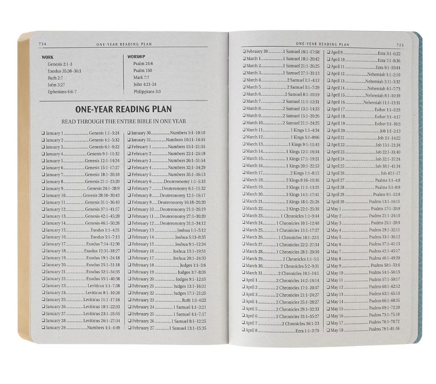 Readers will find the trusted 1769 Oxford Standardized Revision of the King James Version inside. The standard 8-point print is set in a convenient double-column format, and helpful tools like a one-year Bible reading plan and a thematic Scripture verse finder are included to guide engagement with God’s Word. The Bible has a lay-flat binding to protect the spine from damage and a presentation page that makes it an affordable gift item.