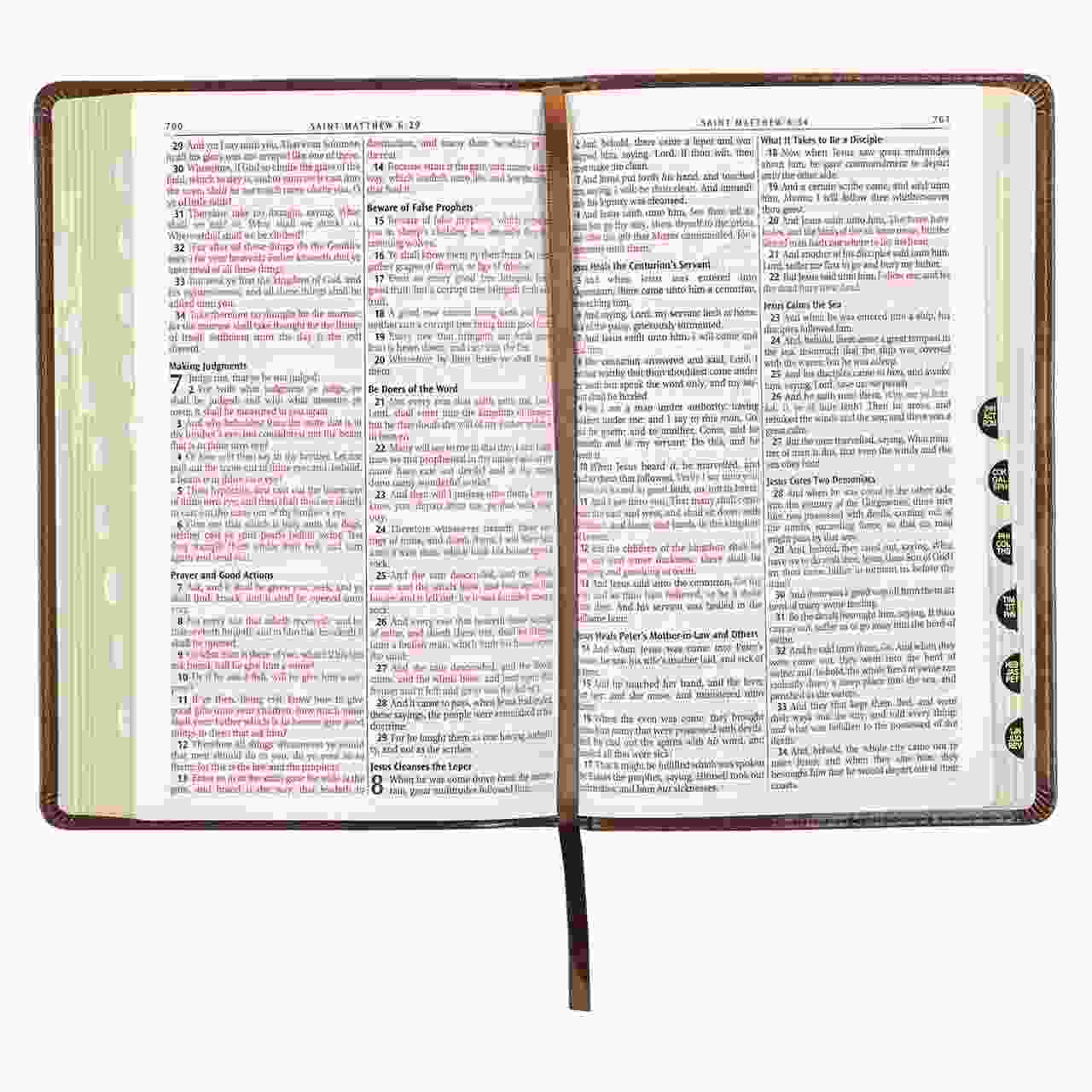 Standardowa czcionka 9-punktowa w formacie dwukolumnowym, indeks kciuka, przyjazne dla czytelnika podtytuły, wyszukiwarka tematycznych wersetów biblijnych, 8 pełnokolorowych map i słowa Chrystusa wydrukowane na czerwono pomogą Ci w studiowaniu Biblii. W zestawie znajduje się roczny plan czytania Biblii, aby utrzymać czytanie Biblii na właściwym torze. W zestawie znajduje się strona prezentacji, którą można uzupełnić specjalnym zachęcającym przesłaniem, na wypadek gdybyś zdecydował się podarować tę piękną Biblię KJV.