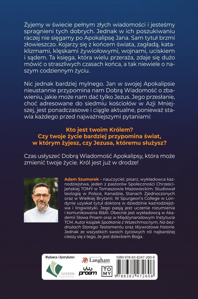 Żyjemy w świecie pełnym złych wiadomości i jesteśmy spragnieni tych dobrych. Jednak w ich poszukiwaniu raczej nie sięgamy po Apokalipsę Jana. Sam tytuł brzmi złowieszczo. Kojarzy się z końcem świata, zagładą, kataklizmami, klęskami żywiołowymi, wojnami, uciskiem i sądem. Ta księga, która wielu przeraża, zdaje się dużo mówić o straszliwych czasach końca, a tak niewiele o naszym codziennym życiu.