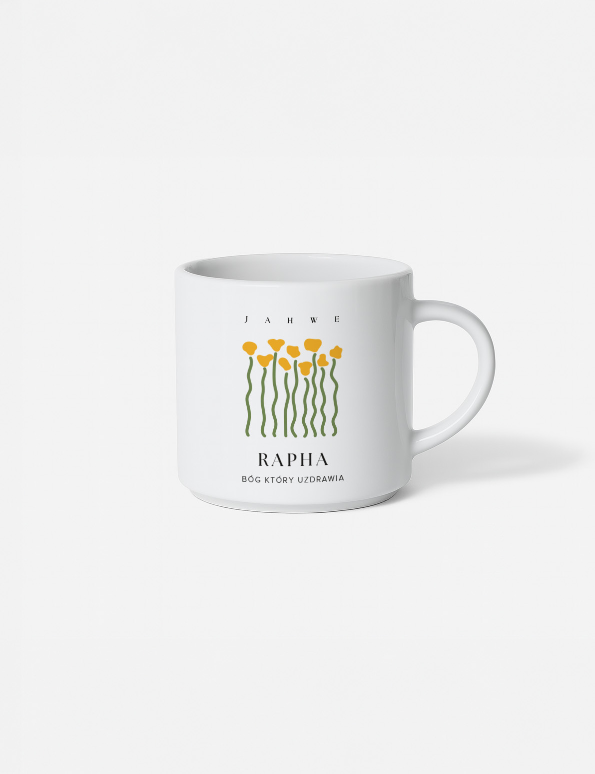 Kubek „Imiona Boga – Rapha” niesie przesłanie uzdrowienia i nadziei. Nadruk zawiera imię „RAPHA” i frazę: „Bóg, który uzdrawia”. To jedno z imion Boga ukazujące Jego troskę o nasze zdrowie fizyczne, duchowe i emocjonalne.
