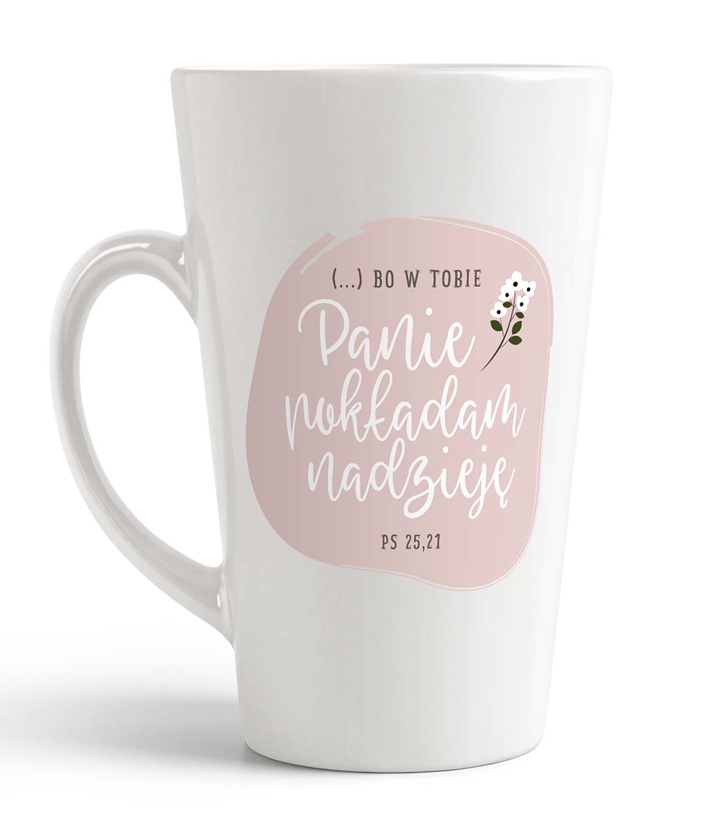 Kubek ceramiczny z wersetem lub tekstem opartym o wartości chrześcijańskie.