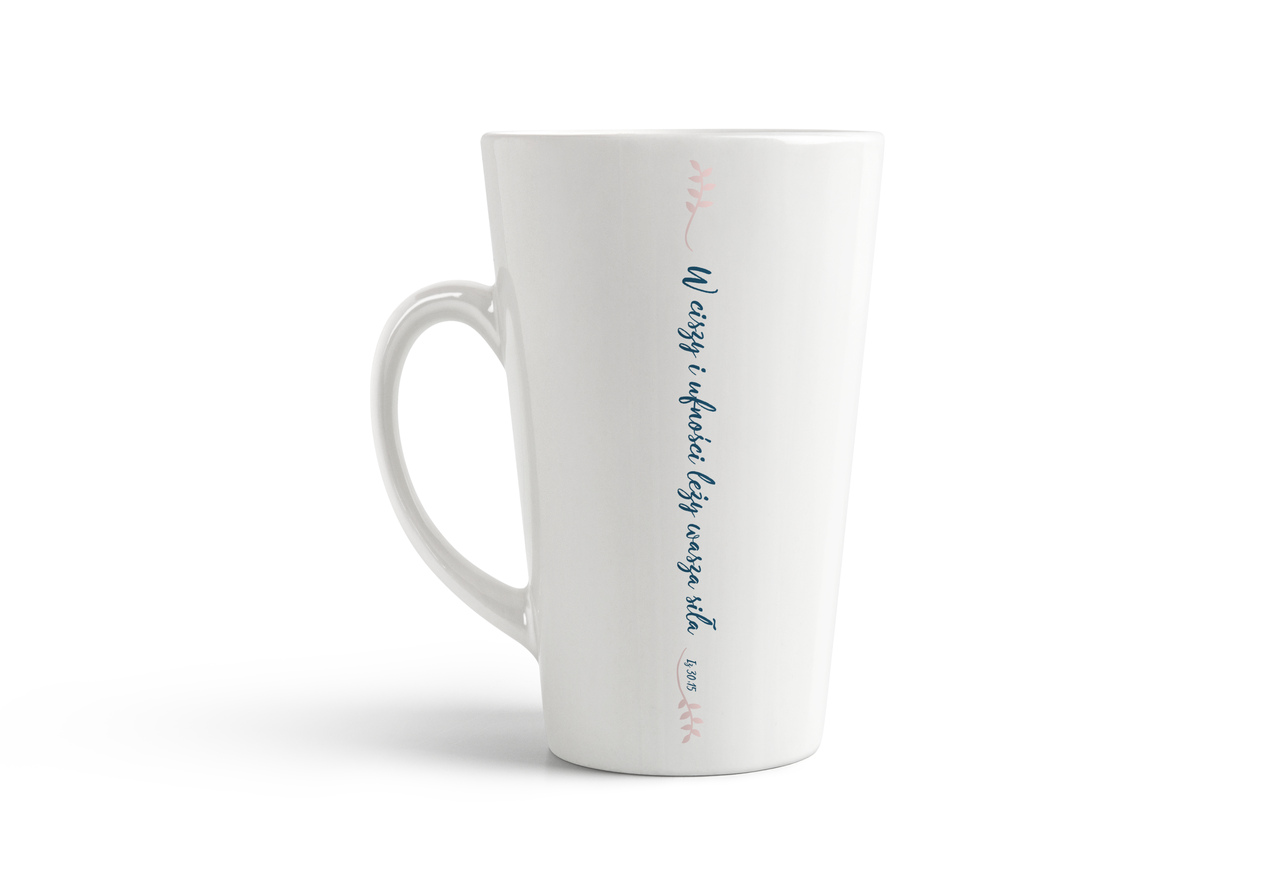 Kubek ceramiczny z wersetem lub tekstem opartym o wartości chrześcijańskie.