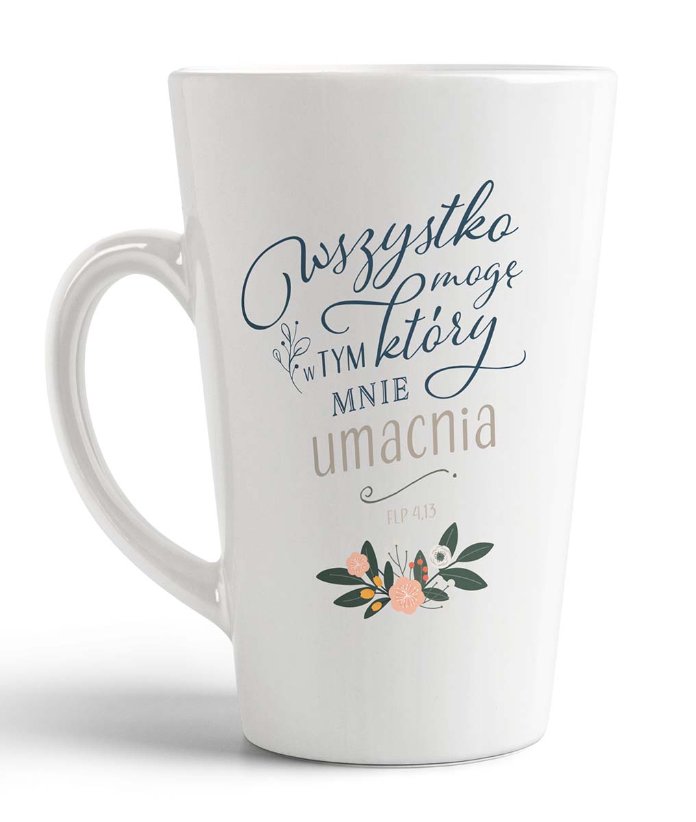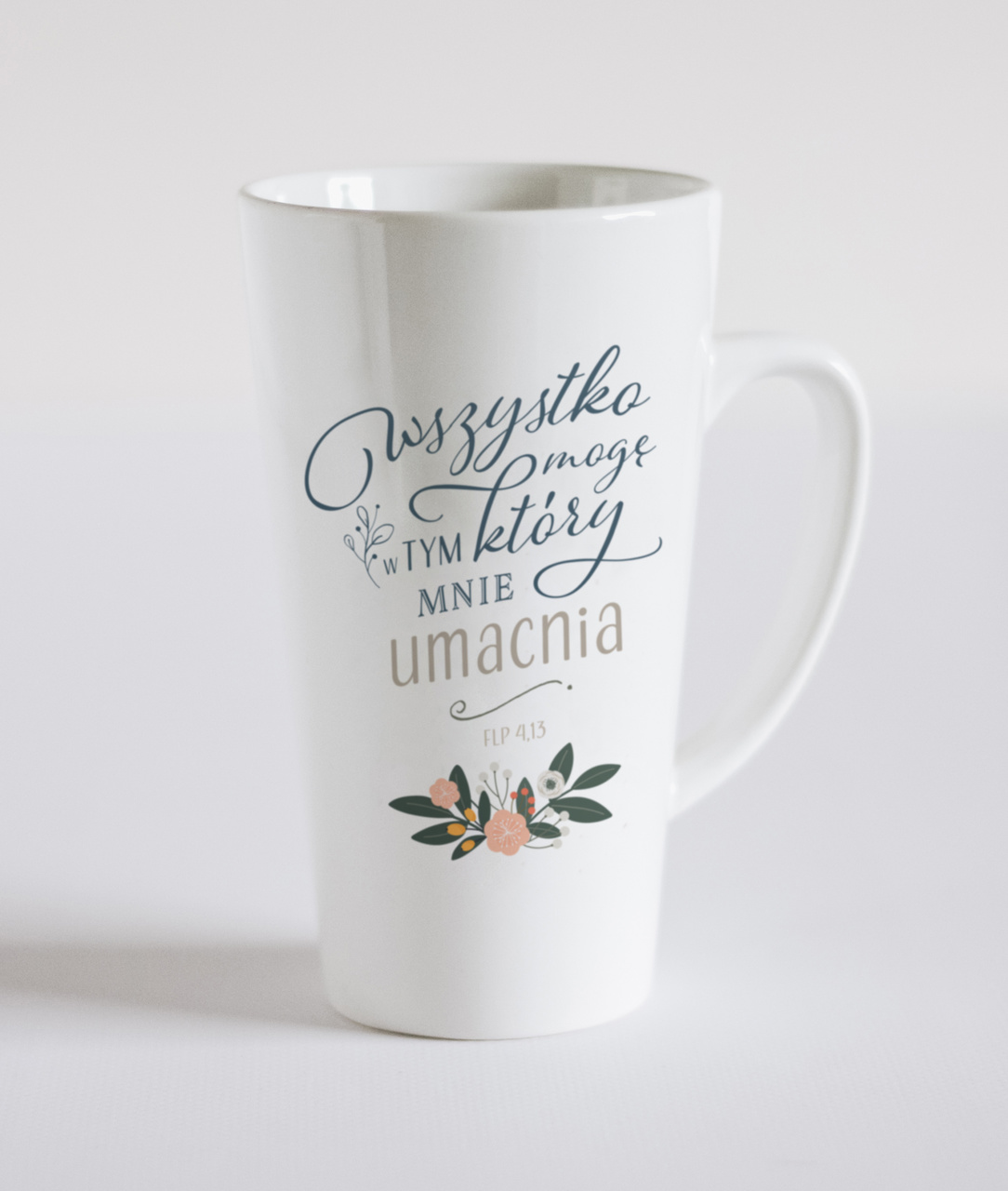Kubek ceramiczny z wersetem lub tekstem opartym o wartości chrześcijańskie.