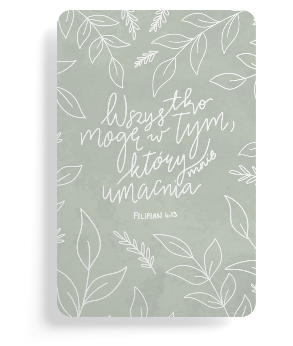Magnes z popularnym cytatem z Listu do Filipian 4,13 – pełen nadziei i mocy Bożego wsparcia. Utrzymany w delikatnej, roślinnej stylistyce, będzie piękną ozdobą w domu lub biurze.