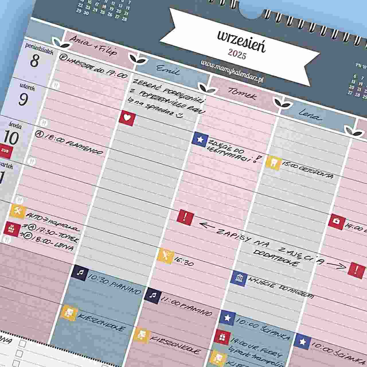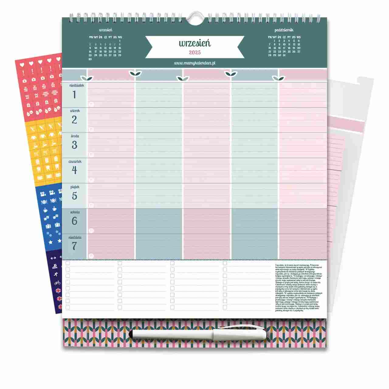 MaMy Kalendarz został stworzony z myślą o rodzinach, które każdego września mierzą się z wyzwaniem organizacji życia po wakacjach. Nowy plan lekcji, zajęcia dodatkowe, zebrania, wizyty u lekarzy, opłaty i obowiązki – wszystko to można z łatwością rozplanować na dużych, tygodniowych kartach. Kalendarz jest idealny także dla nauczycieli, wychowawców czy managerów – wszędzie tam, gdzie potrzebna jest skuteczna organizacja pracy.