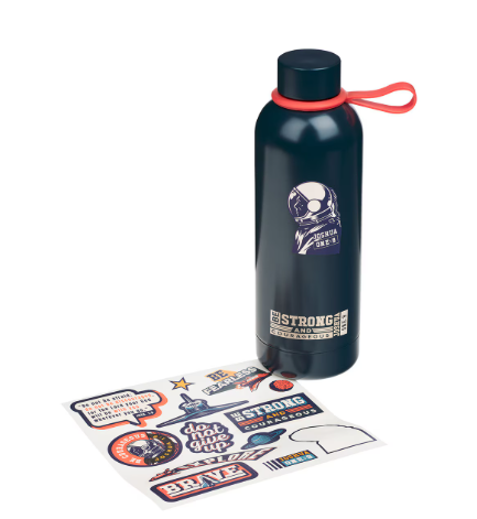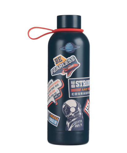W zestawie znajduje się arkusz z ponad 15 naklejkami o tematyce kosmicznej i biblijnej, dzięki którym każdy chłopiec może spersonalizować swoją butelkę. Podwójne ścianki z izolacją próżniową utrzymują temperaturę napojów do 24 godzin, a szczelna zakrętka z silikonową uszczelką i czerwony uchwyt ułatwiają użytkowanie. Pojemność 500 ml – idealna do szkoły, na trening i w podróż.
