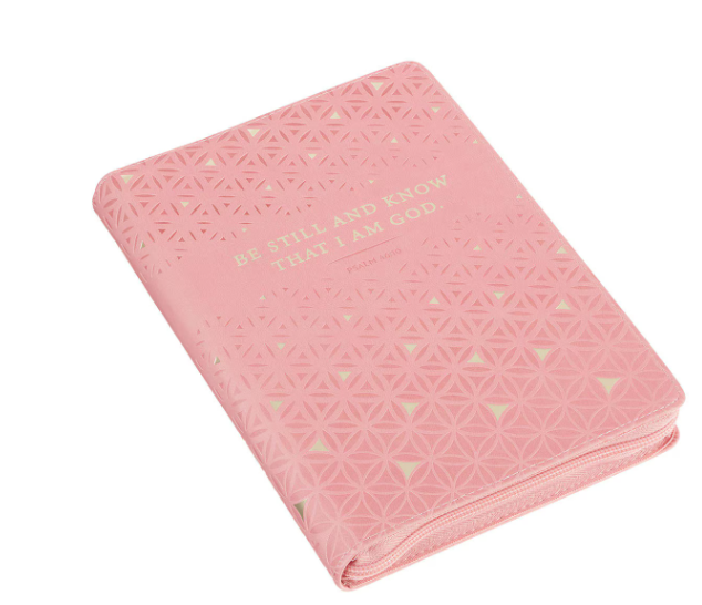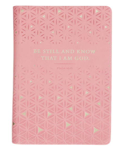 Różowy dziennik z ekoskóry z geometrycznym, tłoczonym wzorem i złoconym cytatem z Psalmu 46:10. Tworzy spokojną przestrzeń do zatrzymania się, modlitwy i refleksji.