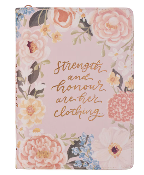 Delikatny, różowy dziennik z ekoskóry z wieńcem pastelowych kwiatów i cytatem z Proverbs 31:25 w rose gold. Łączy kobiecy design z mocnym, biblijnym przesłaniem o sile i godności.