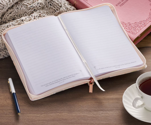 Dziennik ma różowy zamek z metalowym suwakiem, 336 stron w linie z wersetami, wstążkę zakładkę i stronę prezentową. Idealny upominek dla mentorki, liderki lub przyjaciółki.