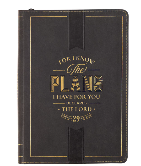 Elegancki dziennik w kolorze ciemnego grafitu z tłoczoną opaską i złoconym cytatem z Księgi Jeremiasza. Idealny jako prezent dla maturzysty lub studenta wchodzącego w nowy etap życia.