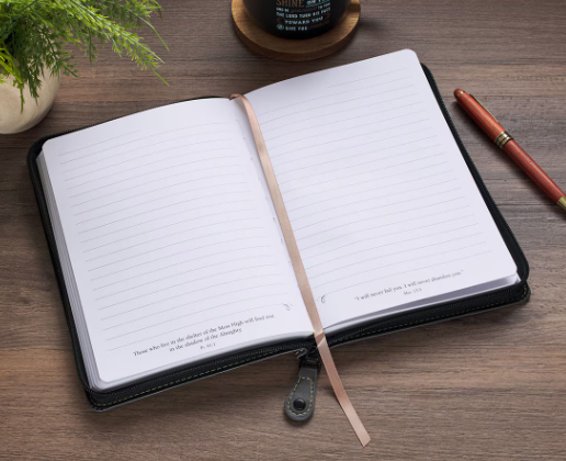 Dziennik ma zamek wokół okładki, 336 stron w linie z wersetami oraz wstążkę zakładkę. Złote detale nadają mu odświętny, a jednocześnie klasyczny charakter.