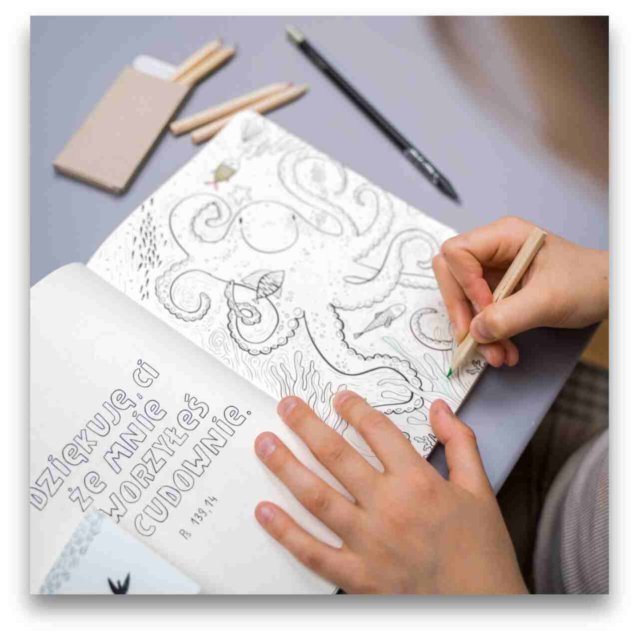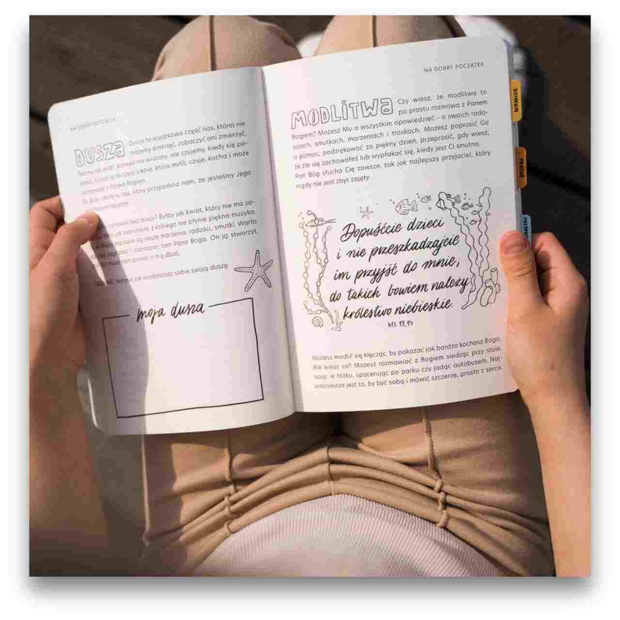 W środku znajduje się dużo miejsca na modlitwy, ilustracje, cytaty z Pisma Świętego do pokolorowania oraz kreatywne zadania.