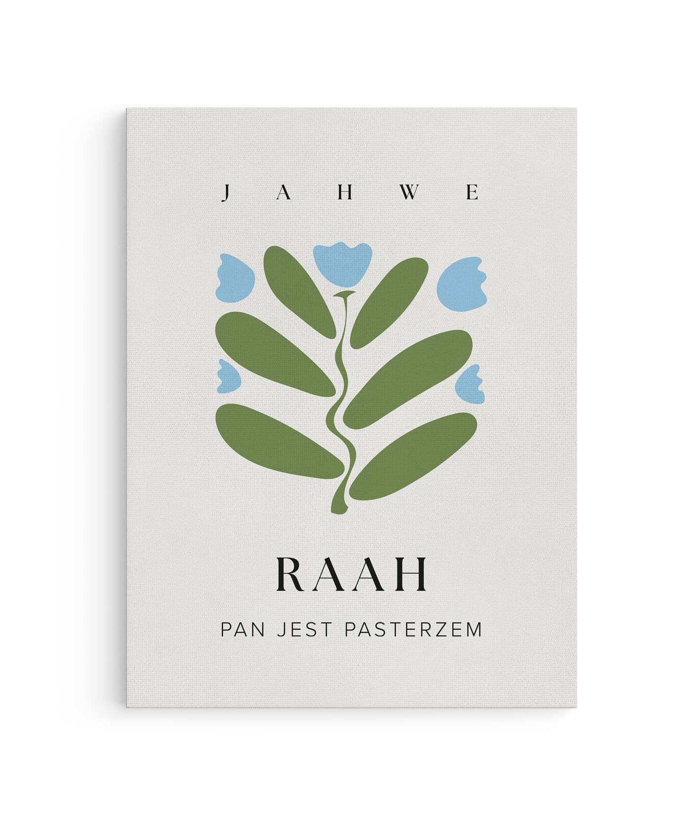Obraz „Raah” z serii Imiona Boga ukazuje Boga jako dobrego pasterza. Prosta grafika w odcieniach zieleni i błękitu pasuje do każdego wnętrza.