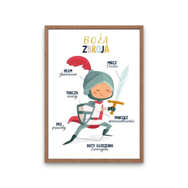 Kolorowy plakat „Zbroja Boża” inspirowany fragmentem z Listu do Efezjan (Ef 6,10-18) to wyjątkowa ilustracja, która w przystępny sposób uczy dzieci, jak „ubierać się w Bożą zbroję” każdego dnia.