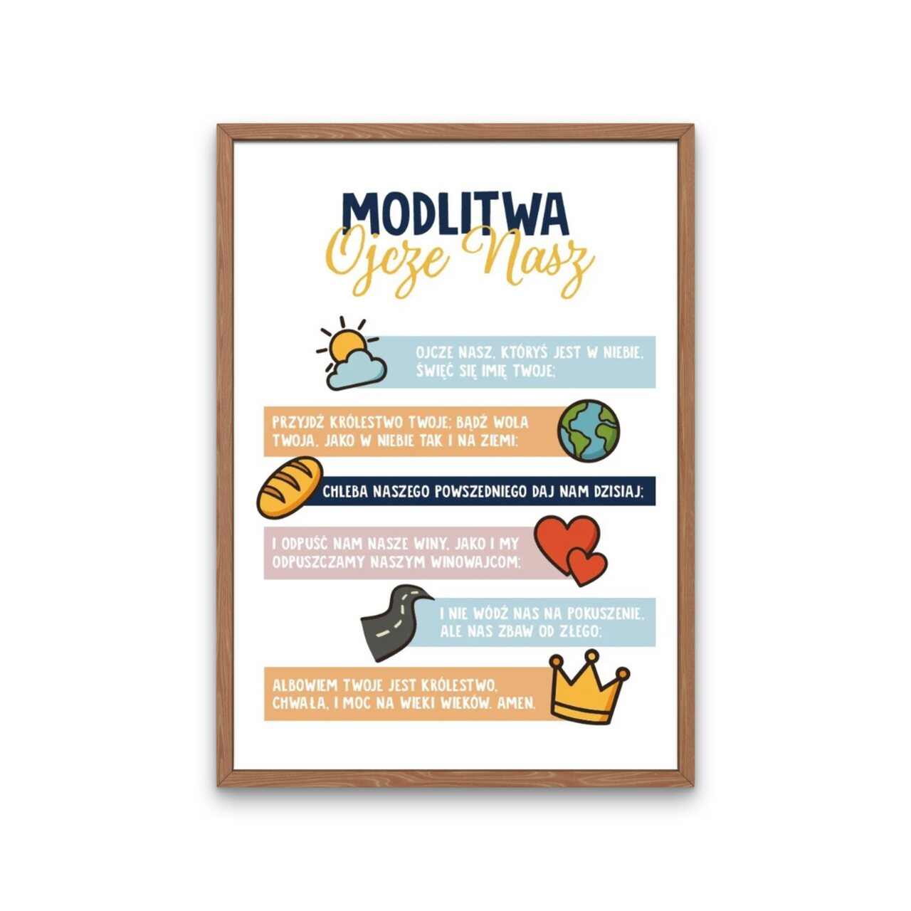 Dzięki radosnym ilustracjom i pastelowym kolorom plakat doskonale pasuje do pokoju dziecka, sali szkółkowej lub przedszkola. Pomaga najmłodszym zapamiętać słowa modlitwy, a jednocześnie stanowi wartościową dekorację.