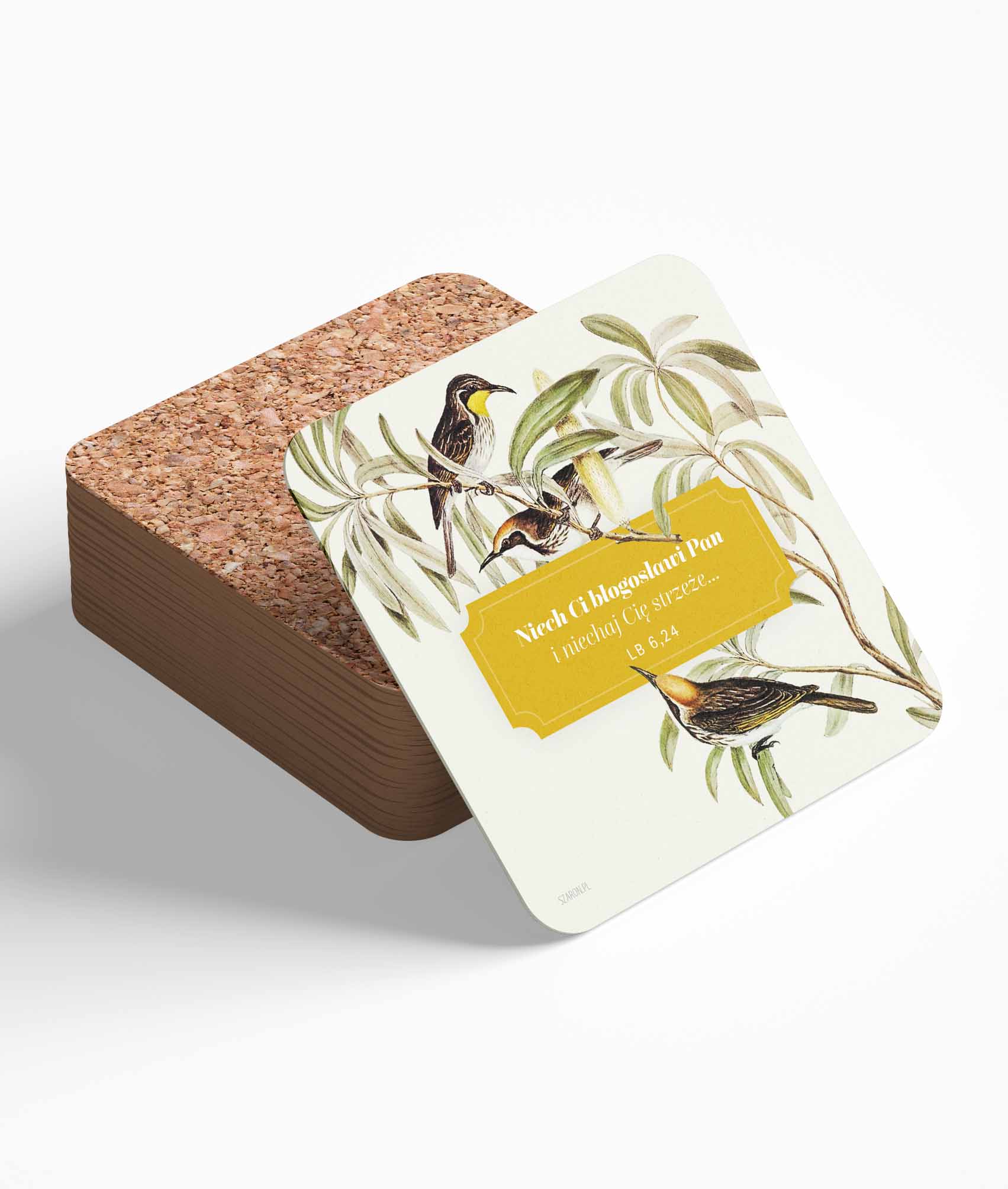 Naturalny korek w rozmiarze 10 × 10 cm sprawia, że podkładka jest trwała i praktyczna. Delikatna grafika nadaje jej szczególnego uroku – to piękny sposób, by otaczać się Bożym Słowem na co dzień.