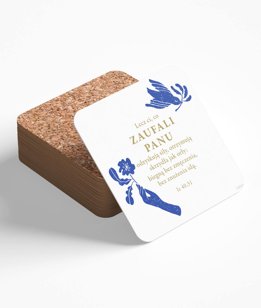 Podkładka korkowa pod kubek z cytatem biblijnym – „Lecz ci, co zaufali Panu, odzyskują siły…” (Iz 40,31)