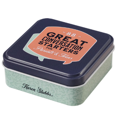 Wewnątrz puszki znajduje się 44 dwustronnych kart z pytaniami do rozpoczęcia rozmowy.
