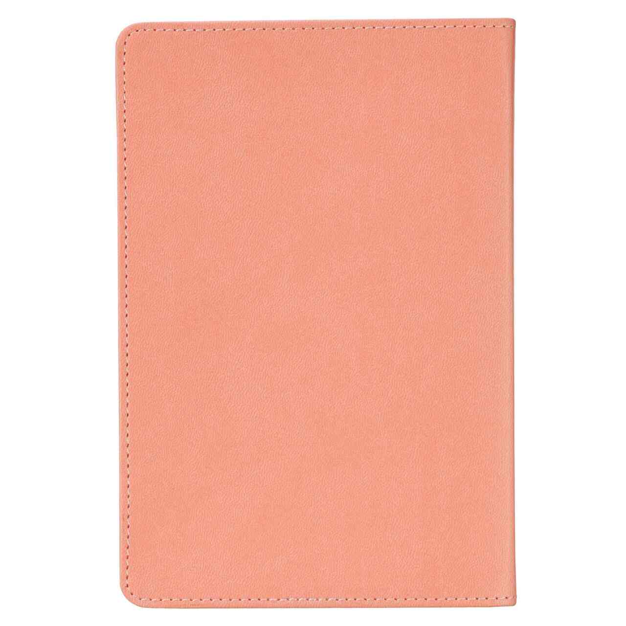 Peach-colored faux leather that matches the appliqued patch on the front covers the spine and wraps around to the back of the book. Peach-colored topstitching secures the devotional’s seams, appliqued patch, and edges to ensure a quality product.