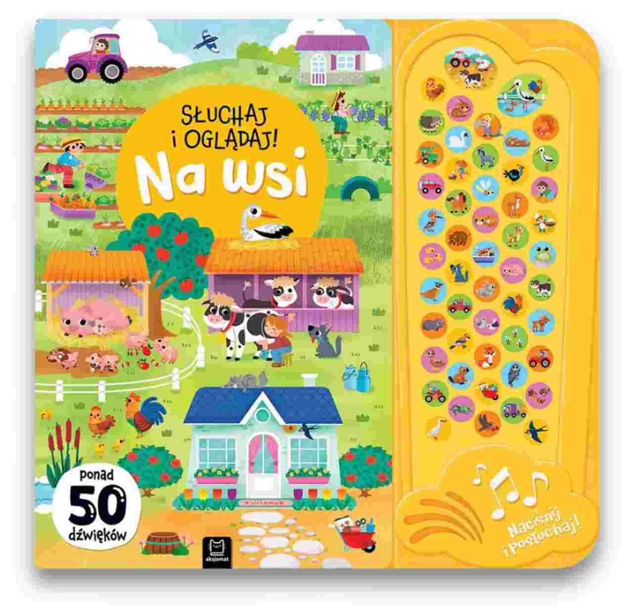 Pięć bogato ilustrowanych rozkładówek przedstawia życie na wsi: dom i podwórko, pastwisko, zagrodę, pole i sad oraz wiejski staw z jego otoczeniem. Oglądaj pełne detali ilustracje, odpowiadaj na pytania, wyszukuj zwierzęta i elementy scen, a przede wszystkim słuchaj ponad 50 realistycznych odgłosów. Kolorowe zakładki pomagają szybko dopasować dźwięki do ilustracji, a prosty panel umożliwia wygodne włączanie i wyłączanie nagrań.