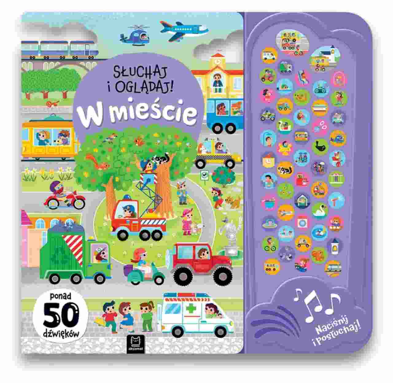 Pięć bogato ilustrowanych rozkładówek przenosi dziecko w tętniące życiem miejsca: starówkę, park, ulicę, centrum handlowe i park wodny. Oglądaj szczegółowe ilustracje, odpowiadaj na pytania, wyszukuj wskazane elementy, a przede wszystkim słuchaj ponad 50 realistycznych odgłosów miasta. Kolorowe zakładki ułatwiają dopasowanie dźwięków do scen, a wygodny panel pozwala włączać i wyłączać nagrania jednym przyciskiem.