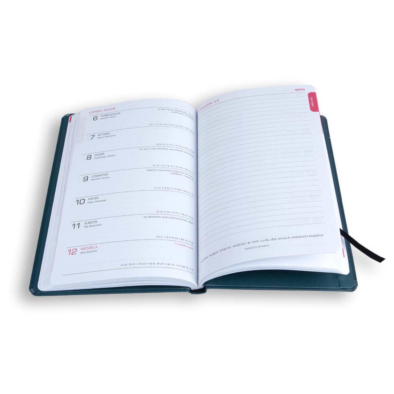 PLANER 2025/2026 granatowy łączy funkcjonalność, elegancję i duchowy wymiar. To doskonały kalendarz dla każdego dobrze zorganizowanego chrześcijanina, który chce zadbać o planowanie i codzienną refleksję.