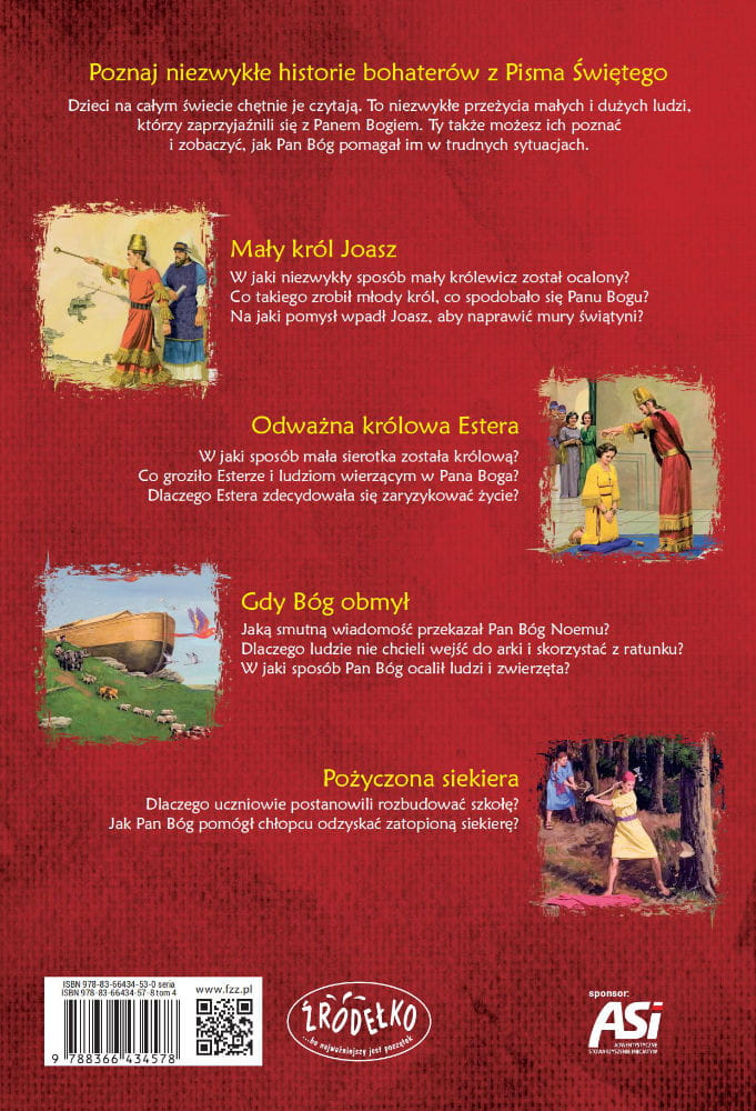 Poznaj niezwykłe historie bohaterów z Pisma Świętego! To niezwykłe przeżycia małych i dużych ludzi, którzy zaprzyjaźnili się z Panem Bogiem. Ty także możesz ich poznać i zobaczyć, jak Pan Bóg pomagał im w trudnych sytuacjach. Sprzedająca się w tysiącach egzemplarzy seria, jest uwielbiana przez dzieci na całym świecie. Pięknie ilustracje zachwycą każde dziecko, a historie wleją w dziecięce serduszka zaufanie i pewność miłości Bożej. Każda historia opatrzona jest również wskazówkami dla rodziców do dalszej rozmowy z dzieckiem.