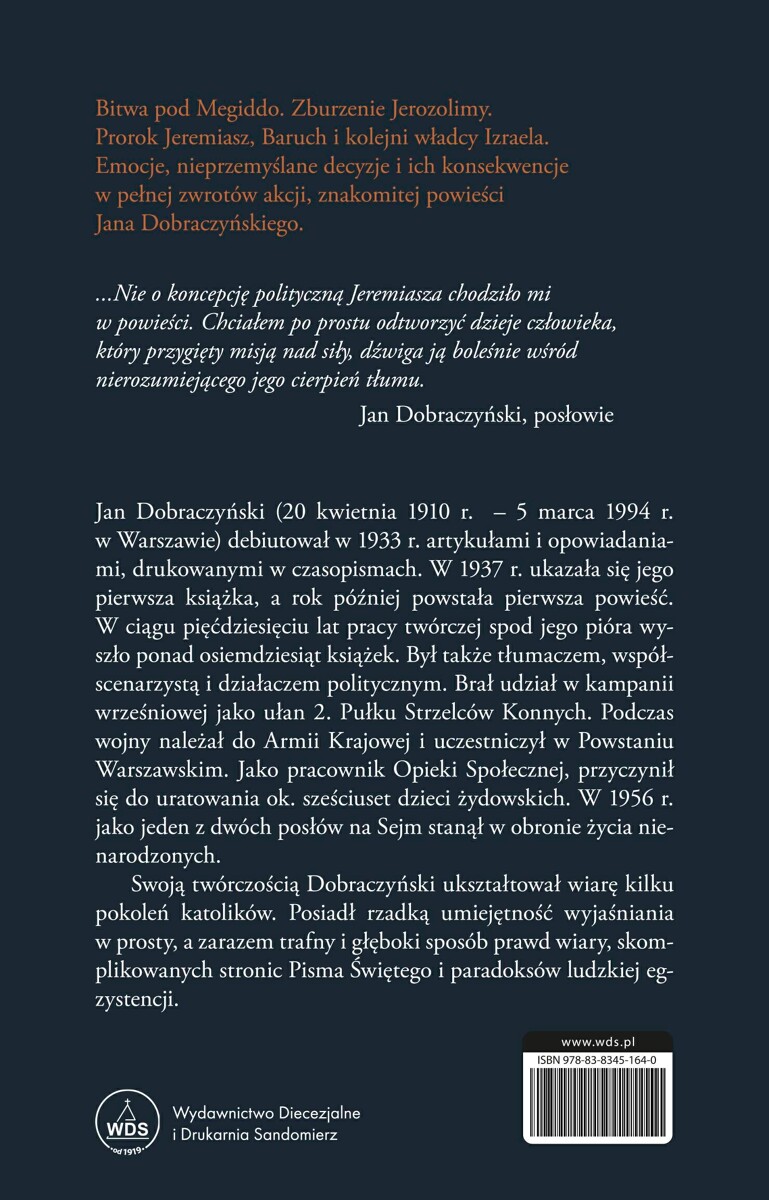 Bitwa pod Megiddo, Zburzenie Jerozolimy. Prorok Jeremiasz, Baruch i kolejni władcy Izraela. Emocje, nieprzemyślane decyzje i ich konsekwencje w pełnej zwrotów akcji, znakomitej powieści Jana Dobraczyńskiego.