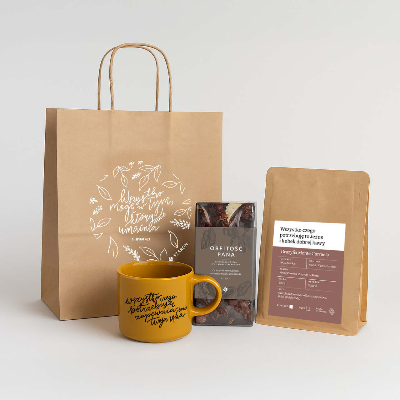Wyjątkowy zestaw prezentowy dla miłośników kawy i dobrych słów – idealny na każdą okazję! W eleganckiej papierowej torbie znajdziesz kubek z inspirującym cytatem biblijnym, aromatyczną kawę Brazylia Monte Carmelo oraz czekoladę „Obfitość Pana” z chrześcijańskiego wydawnictwa Szaron.